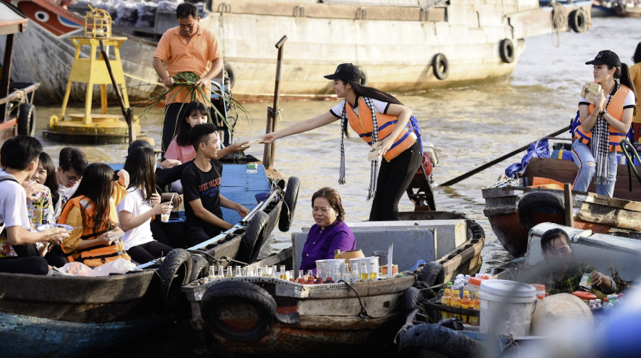 Du khách có thể mua các loại trái cây tươi ngon như xoài, mít, dừa, cam, quýt từ những người bán hàng trên thuyền. Hình ảnh các thuyền trái cây chở đầy màu sắc bắt mắt và tiếng rao bán của các tiểu thương tạo nên một khung cảnh sống động. Nhiều du khách thích mua các món đặc sản tại chợ và thưởng thức ngay trên thuyền, tạo nên một trải nghiệm khó quên.